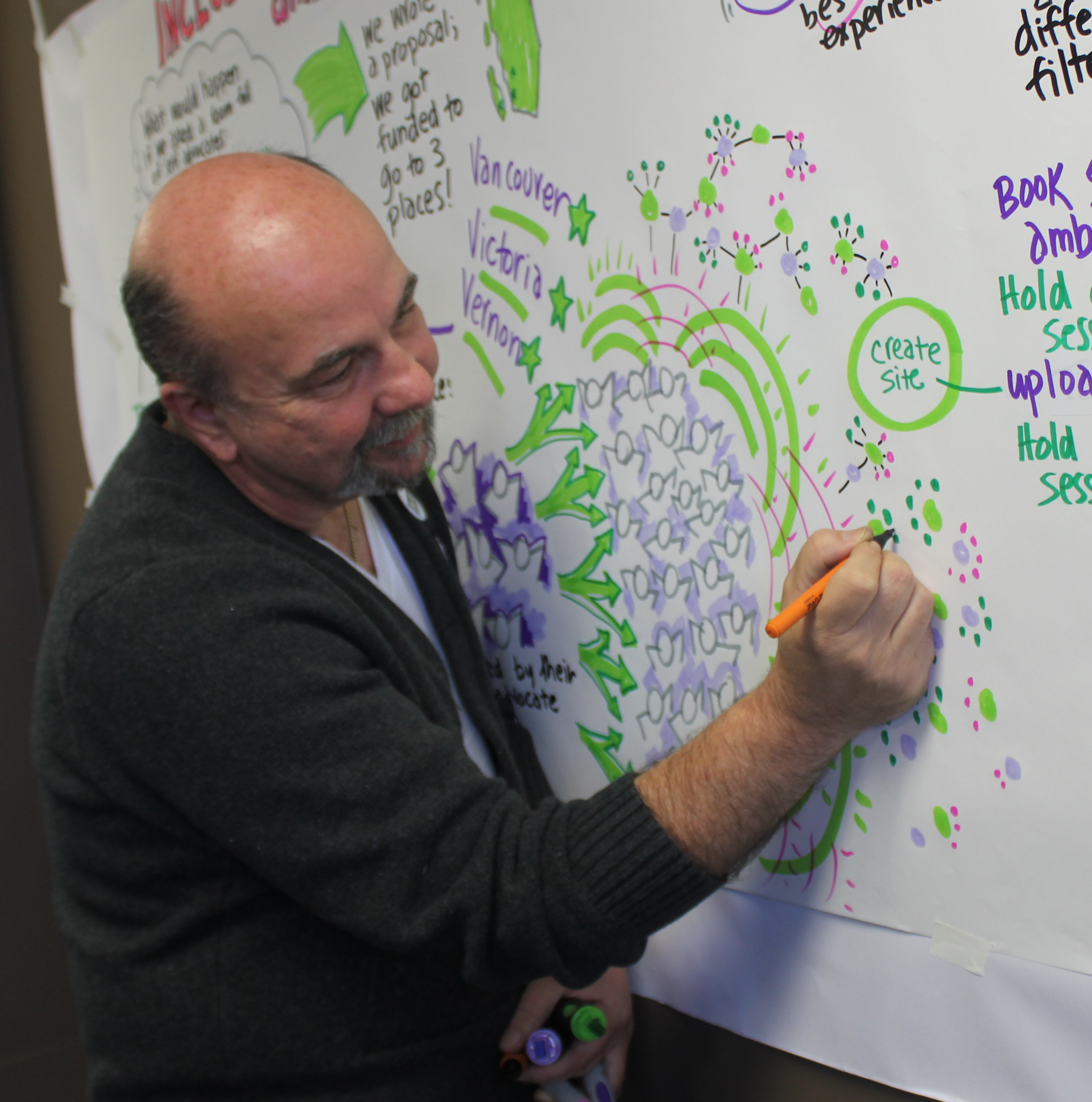 Marianne Williamson says, “Magic happens when you tell the universe what you want it to do for you; miracles happen when you ask how you can be of service to the universe.” My favourite role in all my various work has always been listening. Deep listening is my way to be of service, an active, not a passive, art. My friend and mentor Michael Walsh gave me great advice. Instead of trying to do better what you do least well, and hoping to be average at that thing, focus on what you already do well and do it better. He said, “Figure out the thing you are great at and then become a genius at it.” When we surveyed folks who deal with our agency, Spectrum Society, we were surprised to hear that one of the things they liked best was our ability to listen. We began to strive for optimal in our listening… and for me, that led to graphic facilitation.